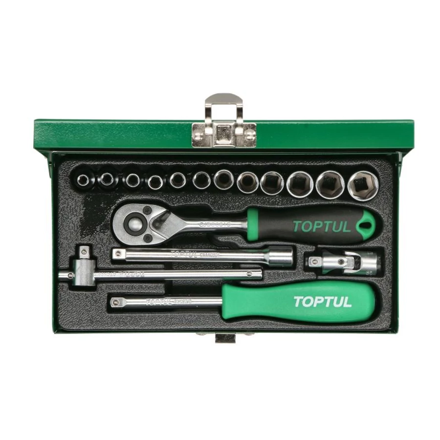 A TOPTUL 1/4” racsnis dugókulcs készlet egy kompakt és jól használható szerszámkészlet, amely ideális választás autószereléshez és kisebb javítási munkákhoz.